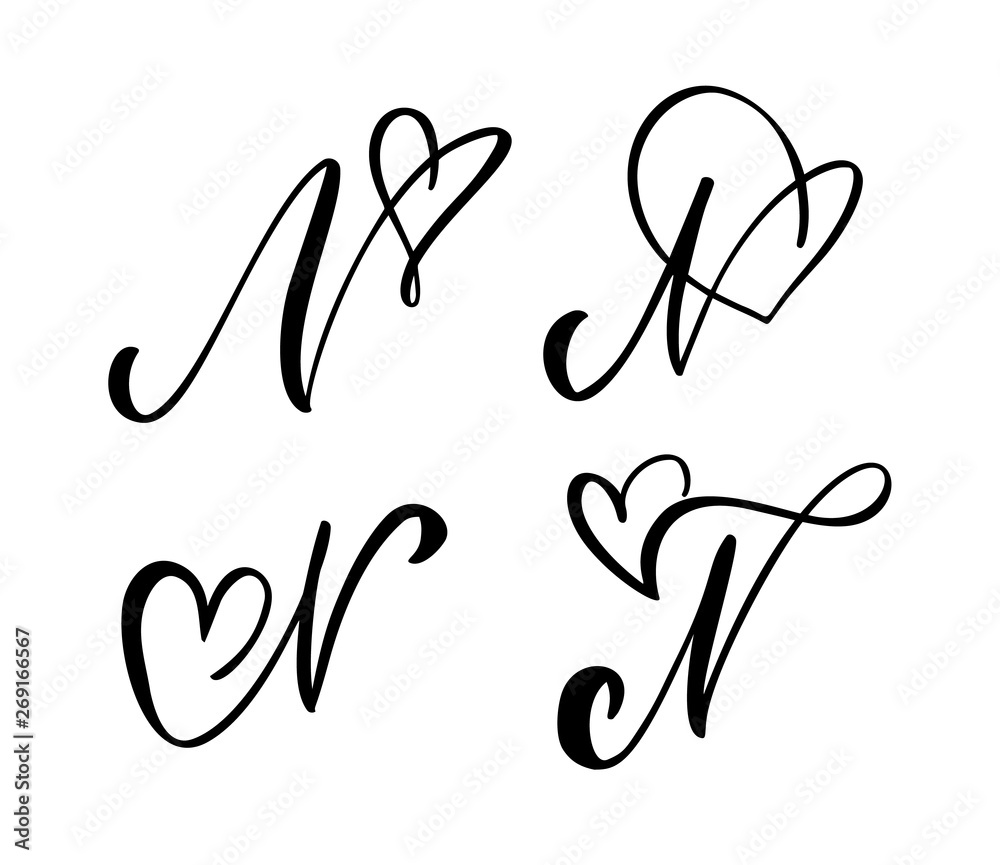 Vector Set Of Vintage Floral Letter Monogram N Calligraphy Element Valentine Flourish Hand Drawn Heart Sign For Page Decoration And Design Illustration Love Wedding Card For Invitation Stock Vektorgrafik Adobe Stock
